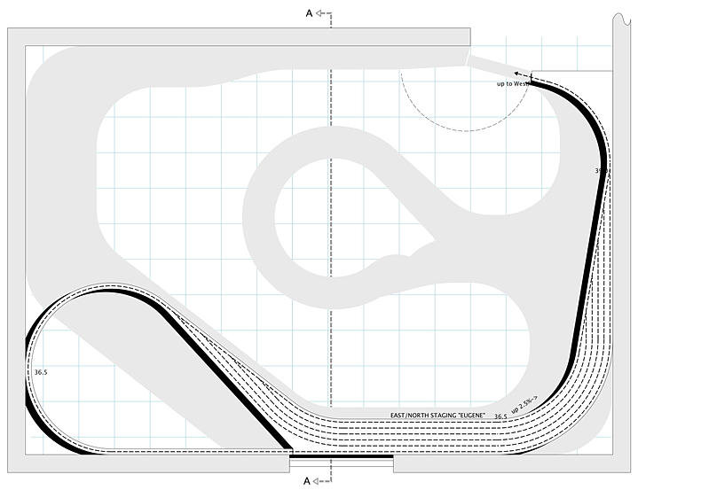 Below is the Trackplan starting with the lowest deck (Eugene staging) and working up to the highest (Klammath Falls staging)